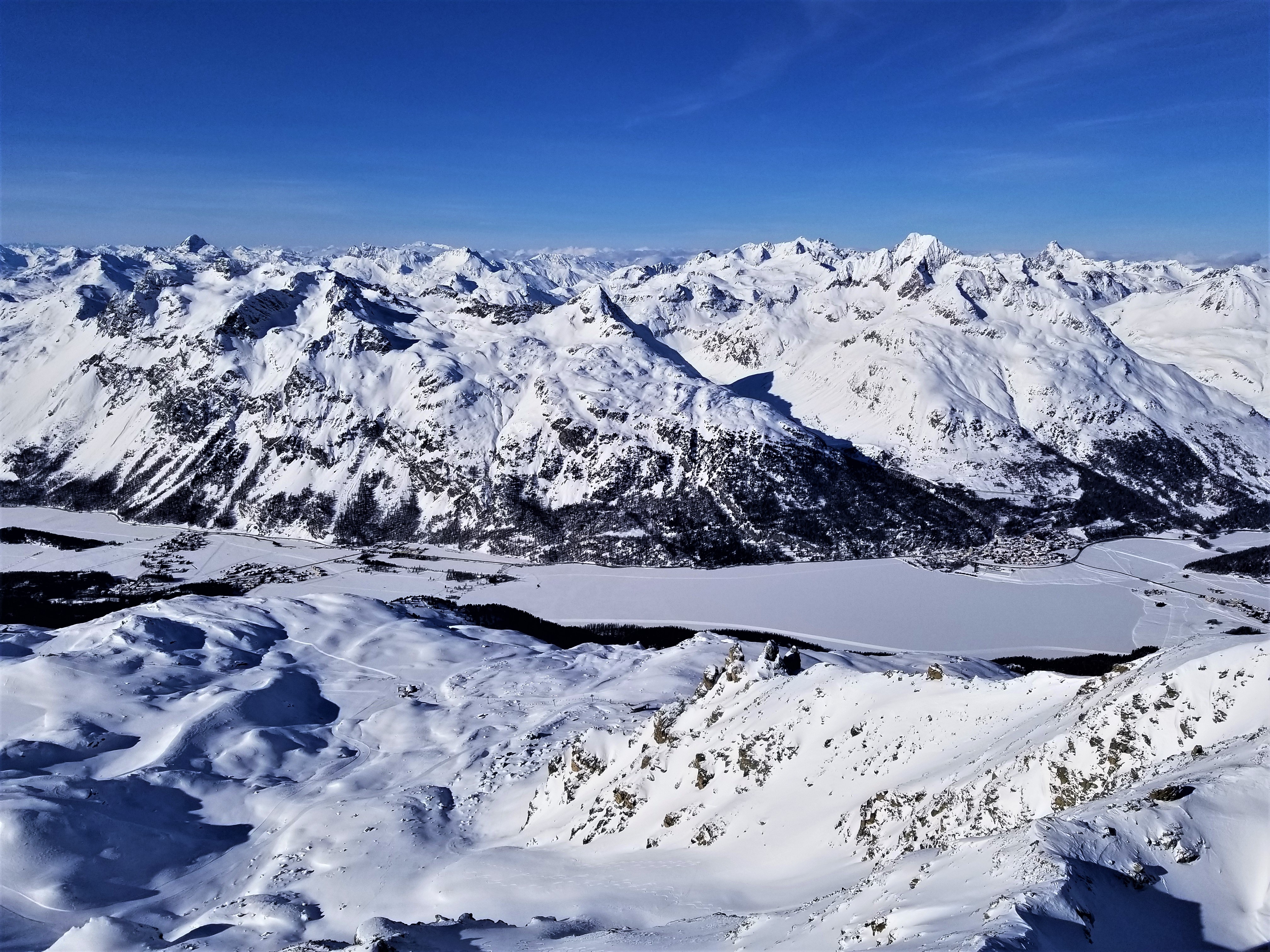 everyone engaged and happy. CLUB MED PHOTOS Monday morning began the 5-days of instructor led lessons. Each skier level had a different meeting time and destination, which changed each day, as posted on the lesson board by the front desk. Of the 3 different ski areas, 2 required bus transportation, and one required a 600m walk. Several of the skier level groups consisted of all or mostly Holmdel Ski Club members. It was important to align with a particular social group on the first day since this was your group for the entire week. Some instructors in a given group level gave frequent lesson tips/assessments, while others mostly guided us around the mountains. Once again, it was important to initially align with your preference of an instructor or a guide. CLUB MEMBERS ON THE SLOPES Skiing in St Moritz is primarily on firm, narrow, groomed runs. Most of the off-piste areas were rocky and covered in hard windslap snow. There were no on-piste moguls, since every run is groomed every day, even after a large dump of snow. The locals all had stiff carving or racing skis. The allure of St Moritz skiing is the various views of the Alps. MOUNTAIN PHOTOS