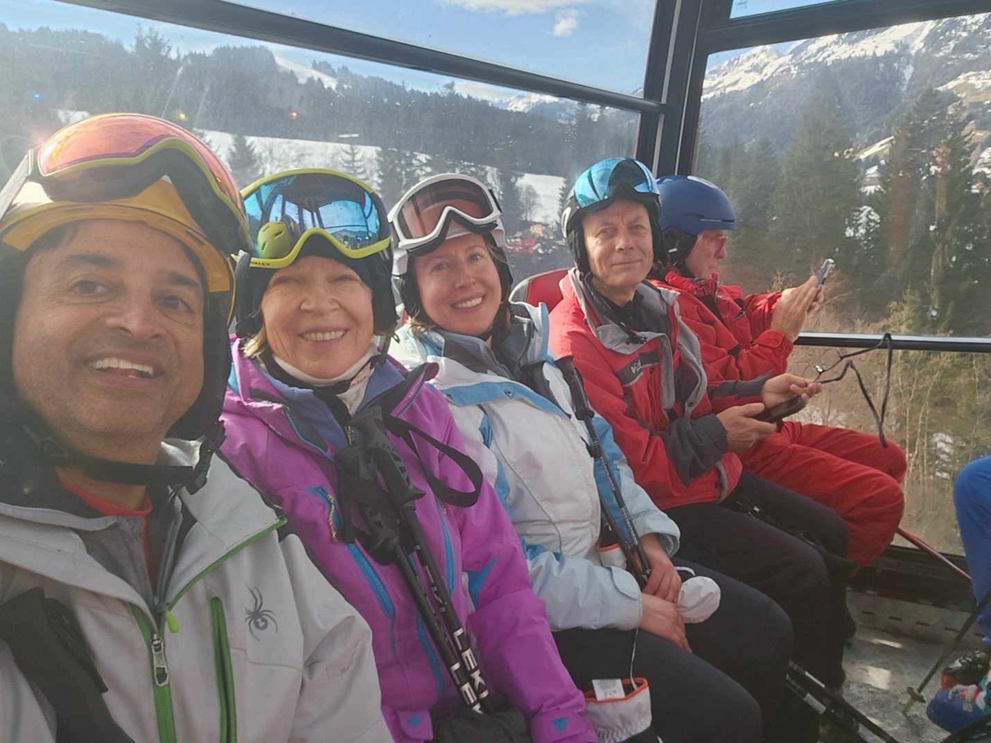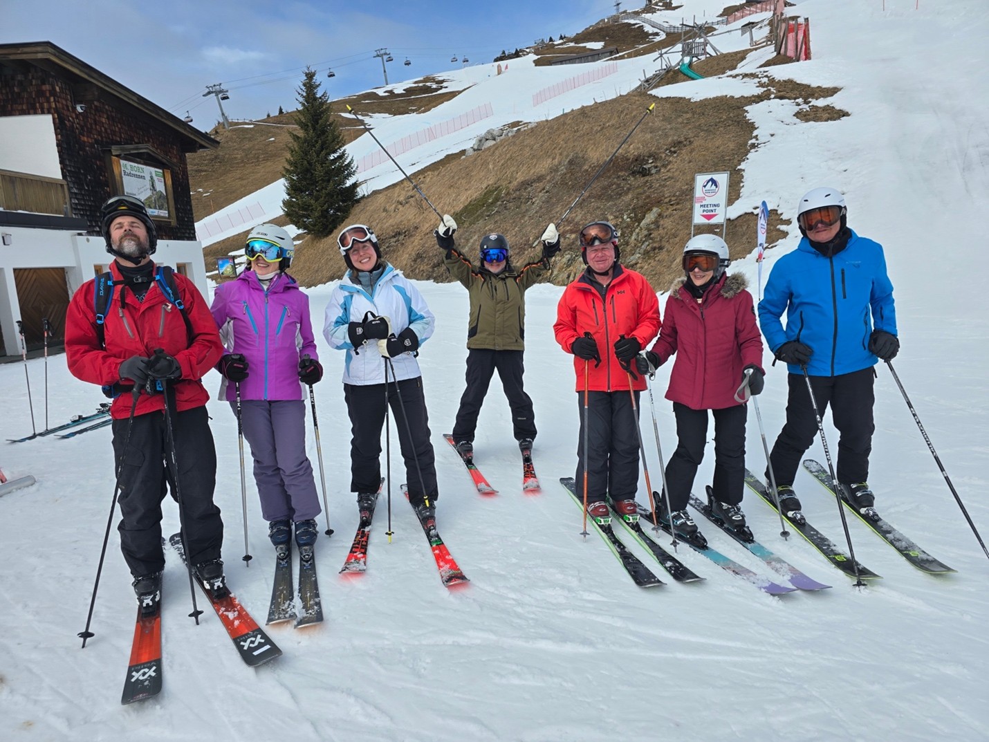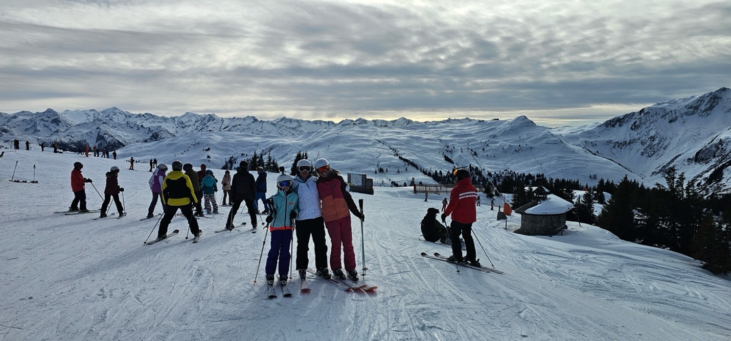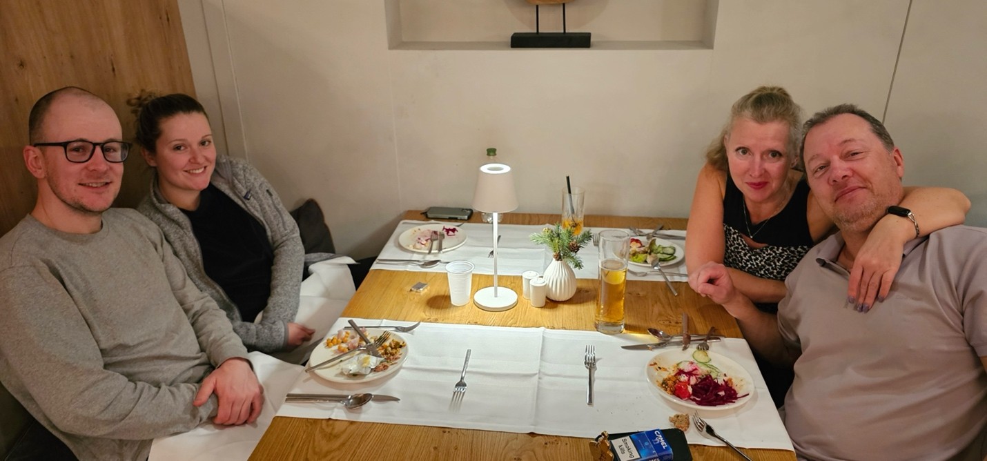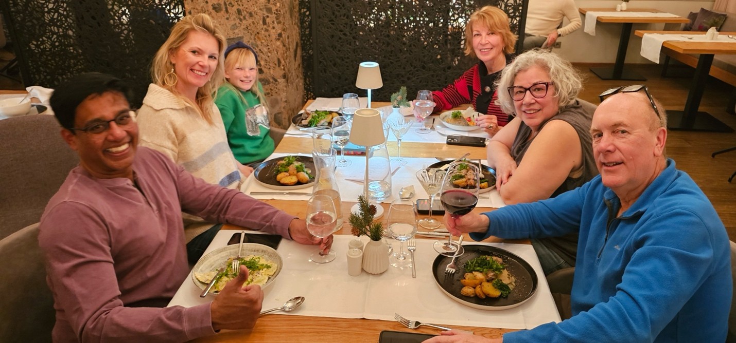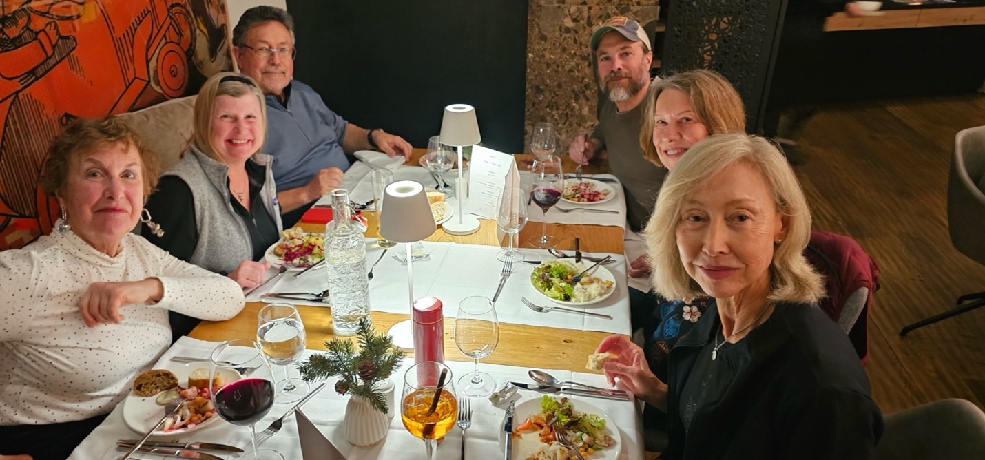 Dining and CommunityMeals were provided at the hotel, with breakfast buffets each morning and four-course dinners (including vegan options) accompanied by a salad buffet each evening. The Maria Theresa Hotel featured an elegant fireplace lounge and bar, creating a welcoming atmosphere. The staff, notably international, were attentive and accommodating, handling special requests with care. Shared spaces such as the lobby bar and lounge area allowed our group to gather, relax, and enjoy meals together fostering a sense of community that makes our club more than just a ski group.