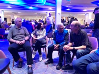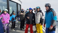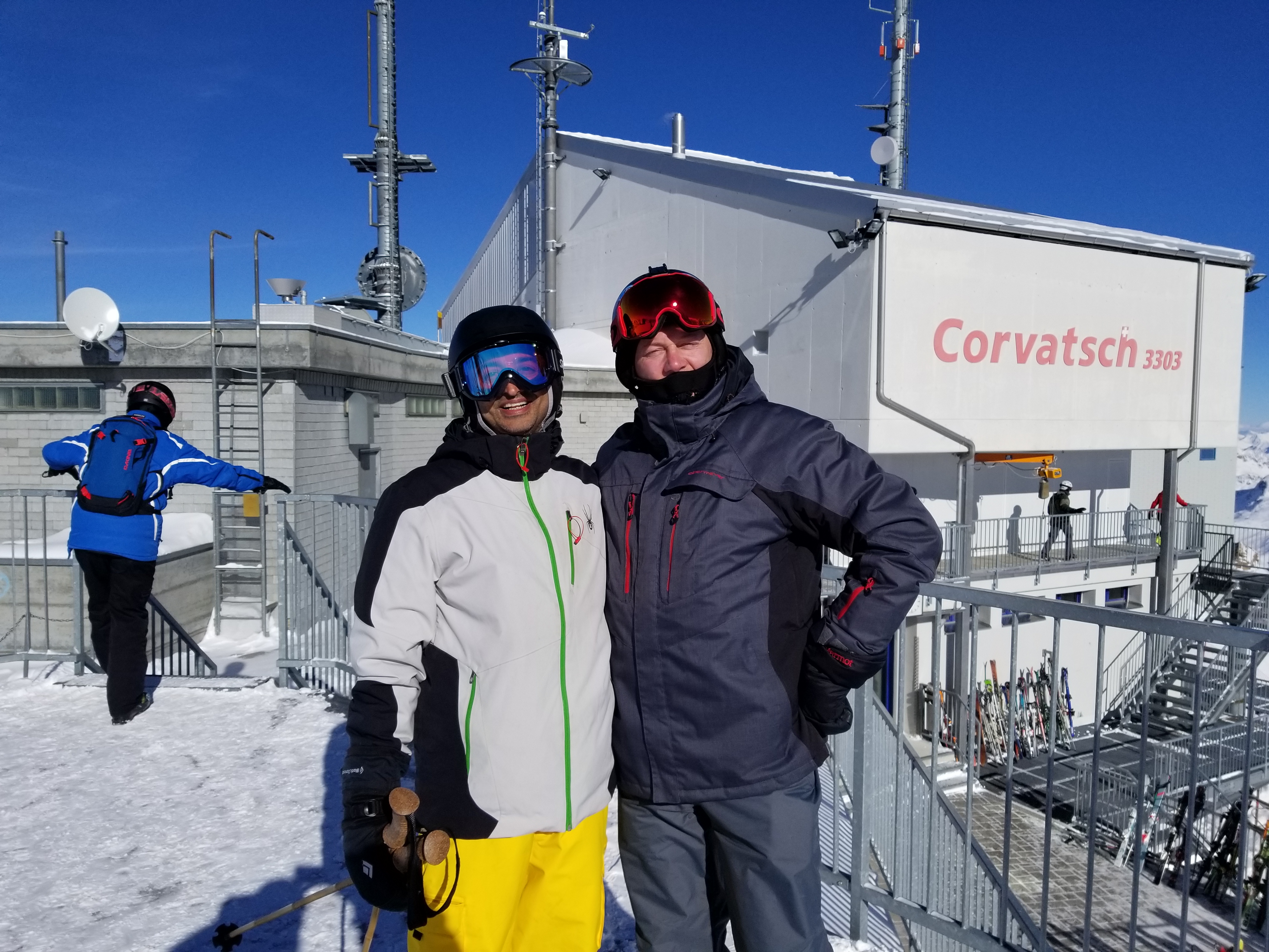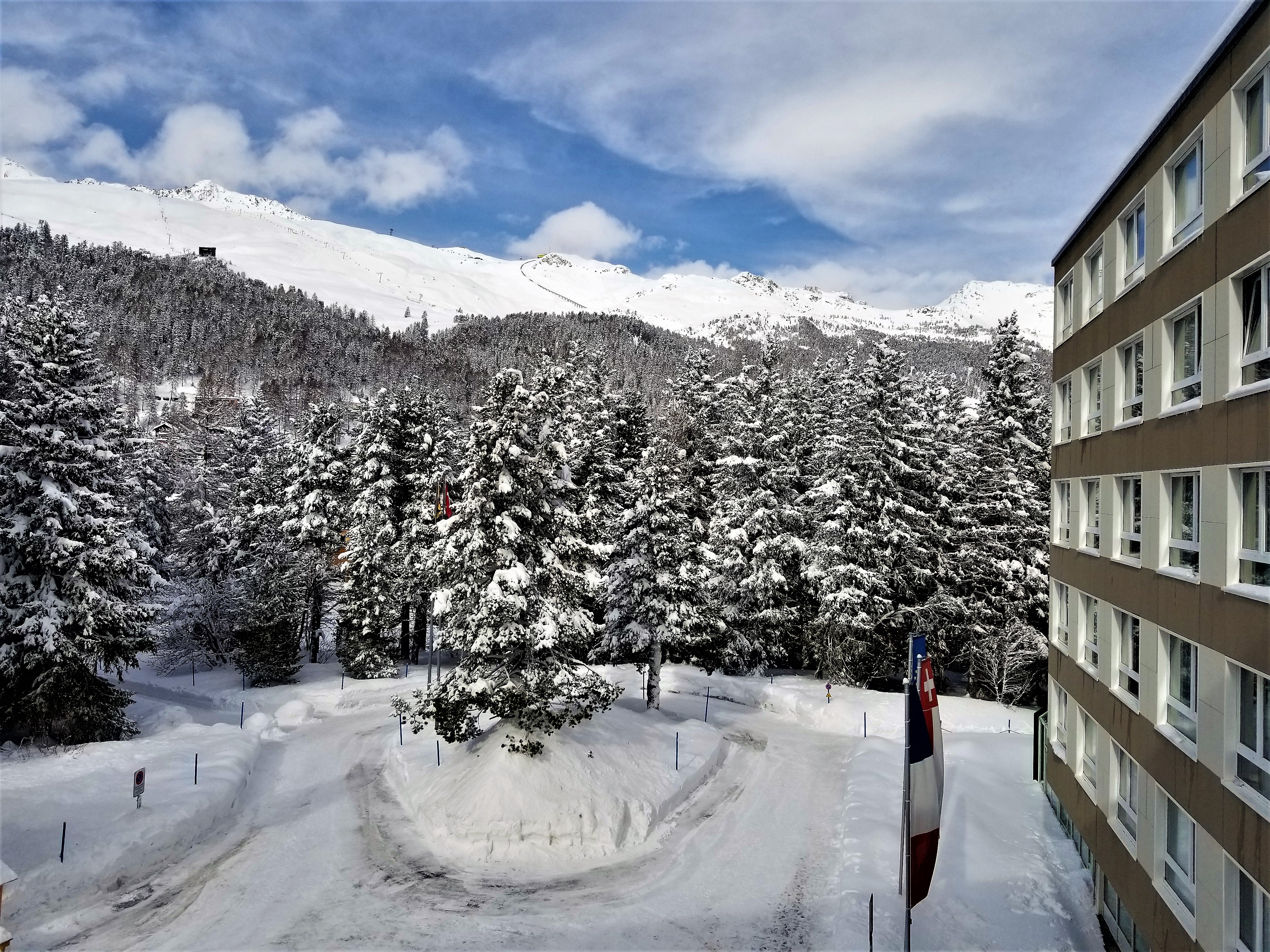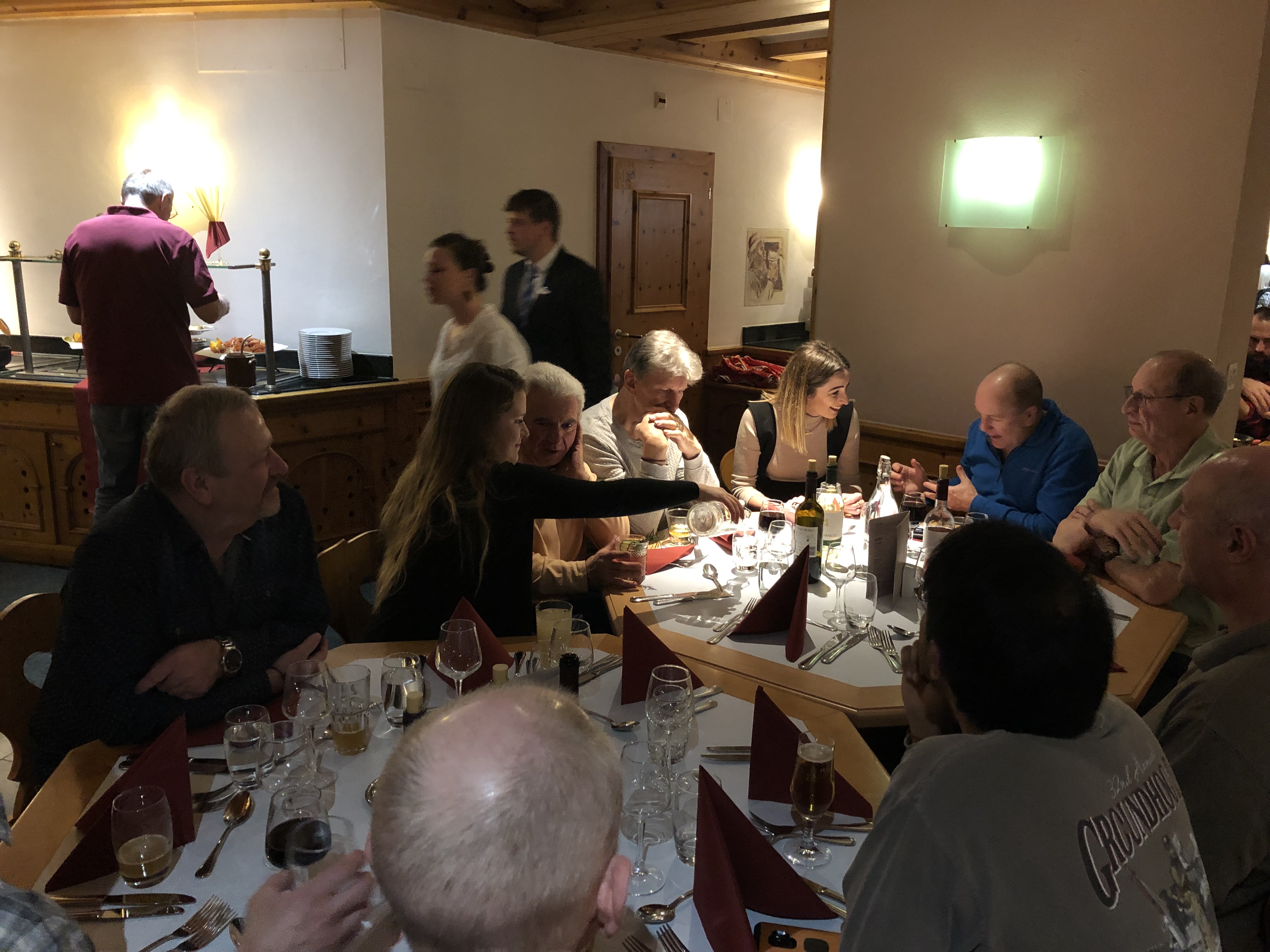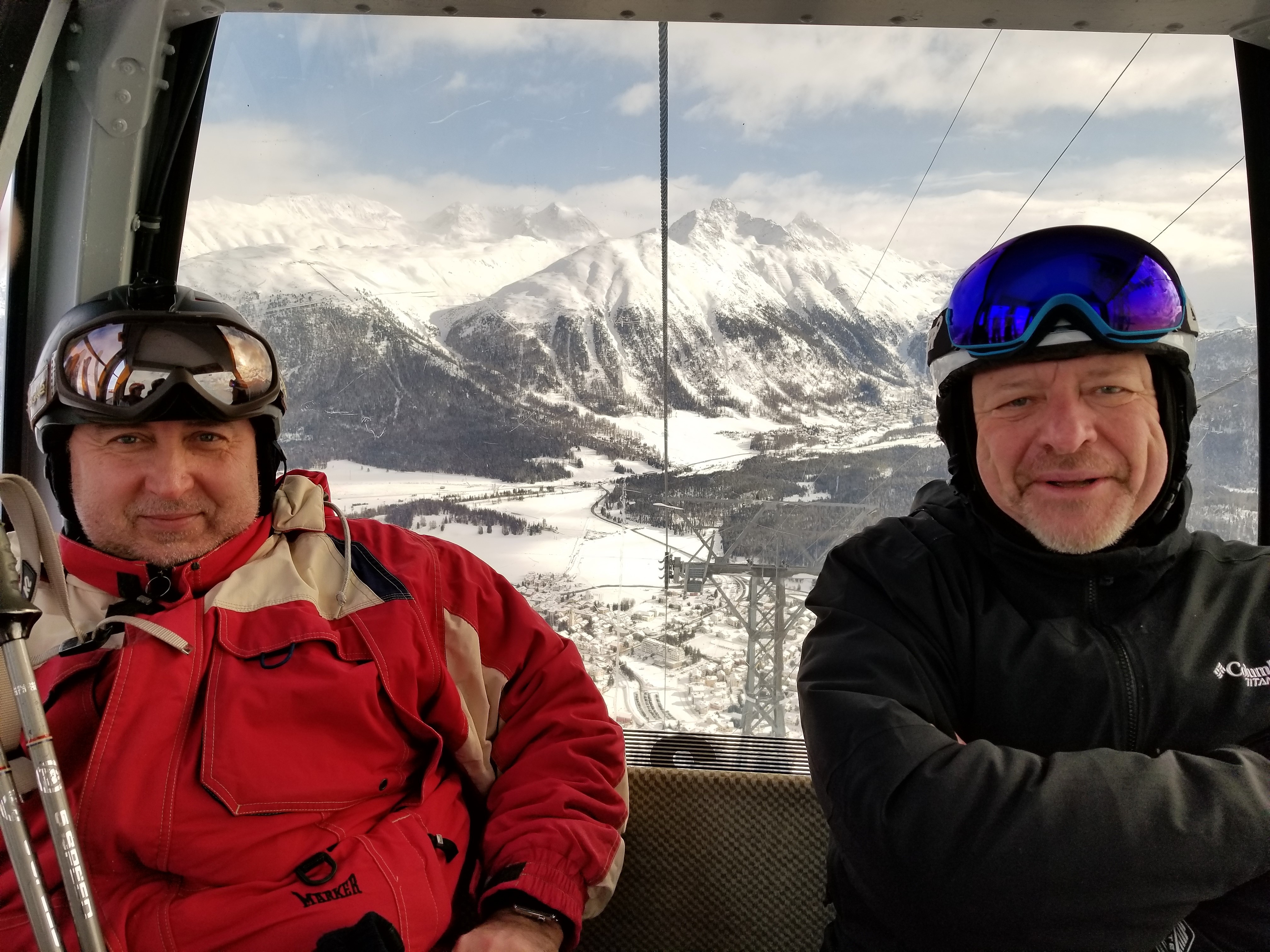 Jan 26-Feb 6, 2019 The group met at Newark airport for the Saturday overnight flight to Zurich. The airport was empty for our 10pm departure, so no lines at check-in, TSA, or the Irish bar across from our gate in Terminal B; a very civilized departure experience. When we arrived in Zurich at 11:30am Sunday morning, the 52 of us loaded our luggage and skis (skis fly for free on Swiss) onto two motor coaches for the 3.5 hour drive via windy switchback roads to the mountain village of St Moritz. When we arrived at Club Med, their "GO" team took our luggage and staged it on the appropriate floor for each of our rooms. Our skis and boot bags were placed outside by the basement ski room door. Unfortunately we weren't told of this segregation of our luggage and it took a while before most of us discovered that our ski stuff was outside, where it was snowing and wet. One couple's boot bag was "lost" in the kerfuffle (Club Med gave them free boot rentals and a lost luggage claim was filed). The ski room was an open area with ski racks where each room had a designated slot in a rack. There were shelves where you could store your boots. If you wanted to secure your skis or boots, you needed to bring a cable lock. Upon entering Club Med we were greeted with drinks and our room packet (keys, ski lift card, CM charge card). Within a few minutes we were all in our rooms and then we went to the bar lobby to enjoy a drink and sign up for lessons by group difficulty number. There was a video that showed what type of skier skill level is appropriate for each level. 1=never-ever; 2=wedge; 3=parallel-slow; 4=parallel-moderate-speed; 5=aggressive-plus-off-piste; 6=cliffs-and-rocks. Since about 70% of the group had been to Club Med